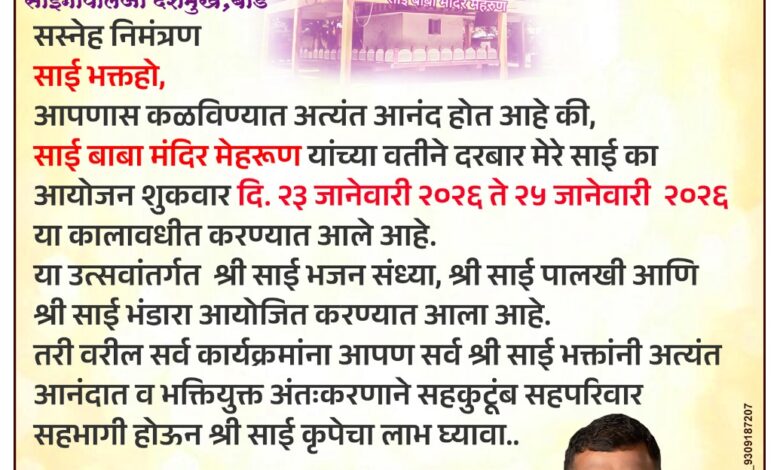 जळगाव : साईबाबा मंदिर, मेहरुण येथे मंदिराच्या १९ व्या वर्धापन दिनानिमित्त विविध धार्मिक कार्यक्रमांचे आयोजन करण्यात आले आहे. वर्धापन दिनानिमित्त दि. २३, २४ व २५ जानेवारी २०२६ रोजी दरबार मेरे साई का हा भव्य धार्मिक कार्यक्रम आयोजित करण्यात आला आहे.